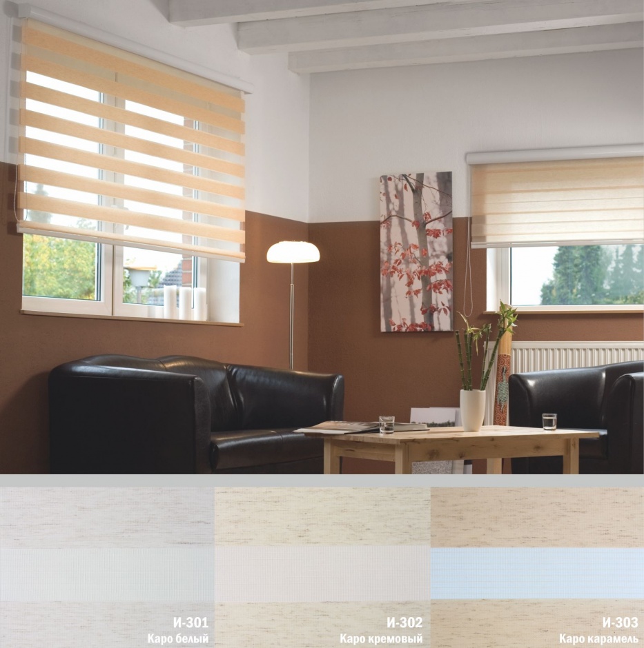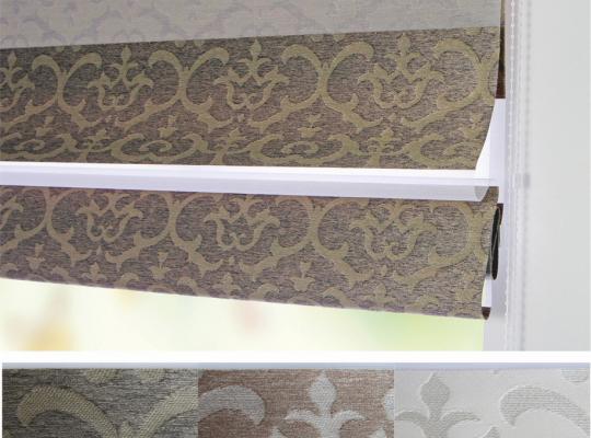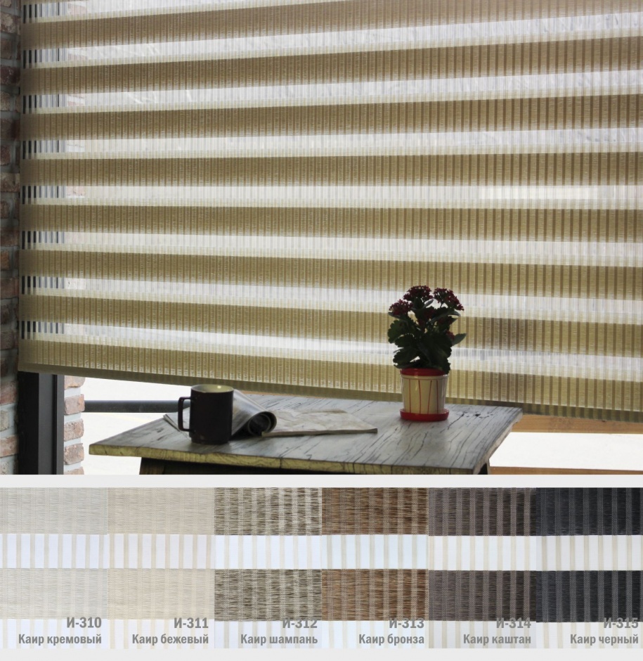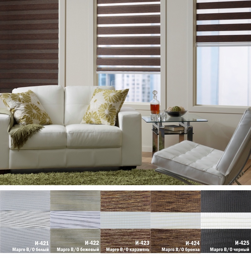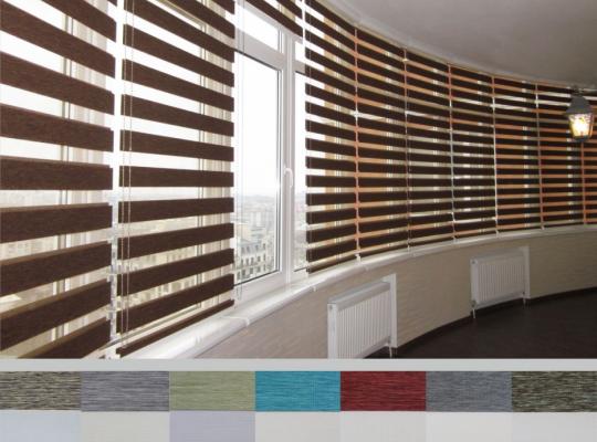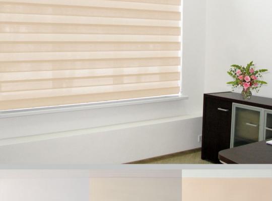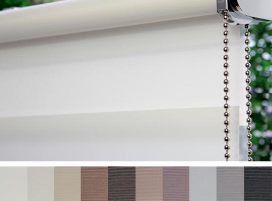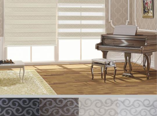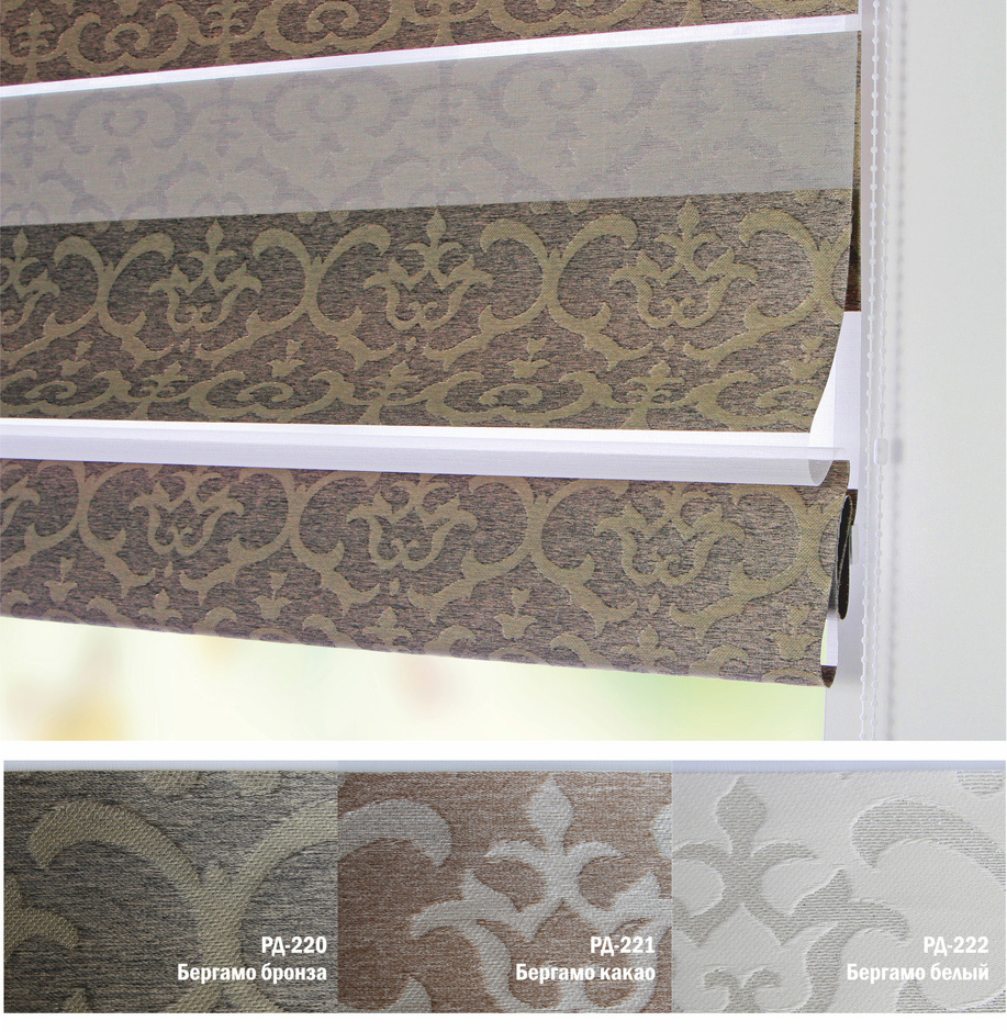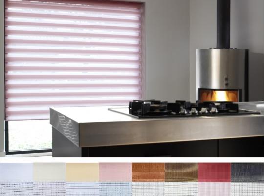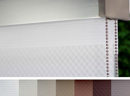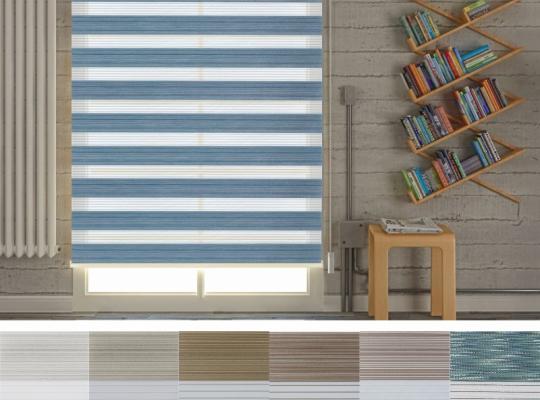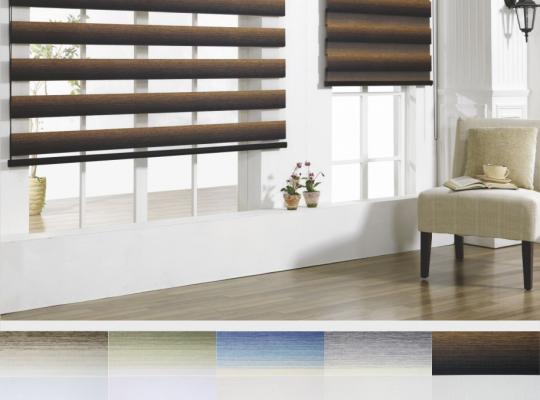 Подвійне полотно складається з горизонтальних смуг, що чергуються. Темні смуги виготовляються із щільних непрозорих матеріалів різних кольорів, а світлі – із легкої сітчастої тканини. Зміна режиму освітлення відбувається за рахунок усунення цих смуг. Штори працюють у трьох режимах: