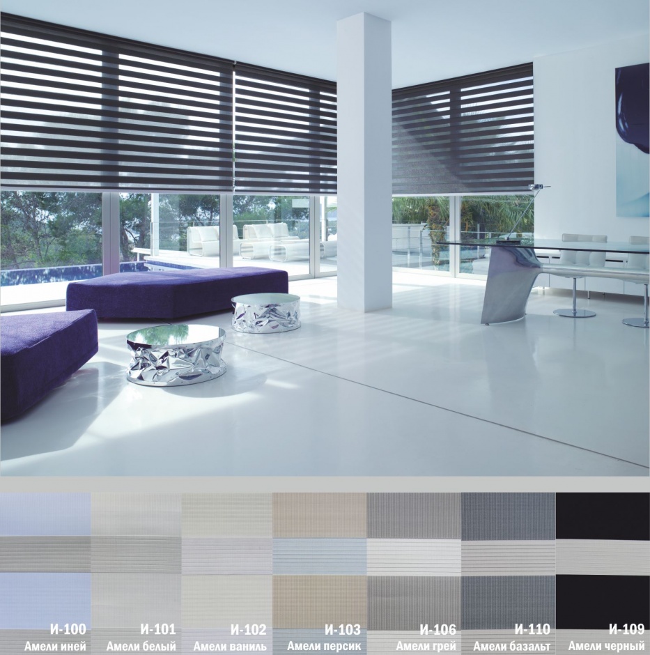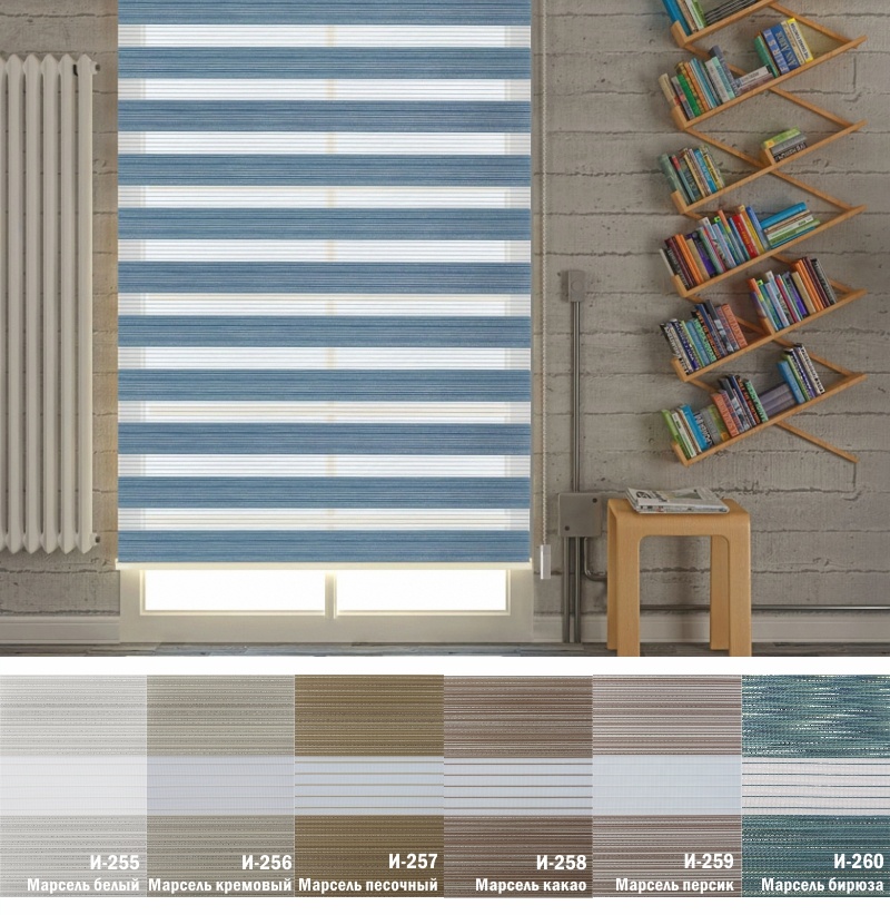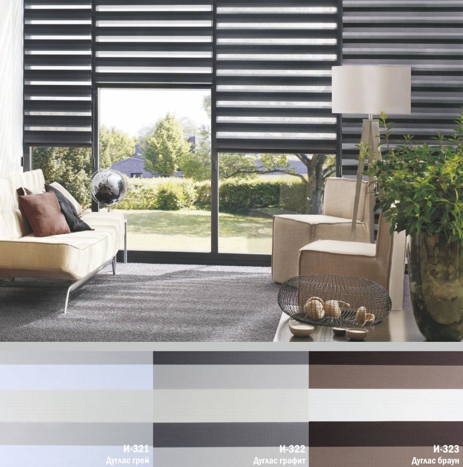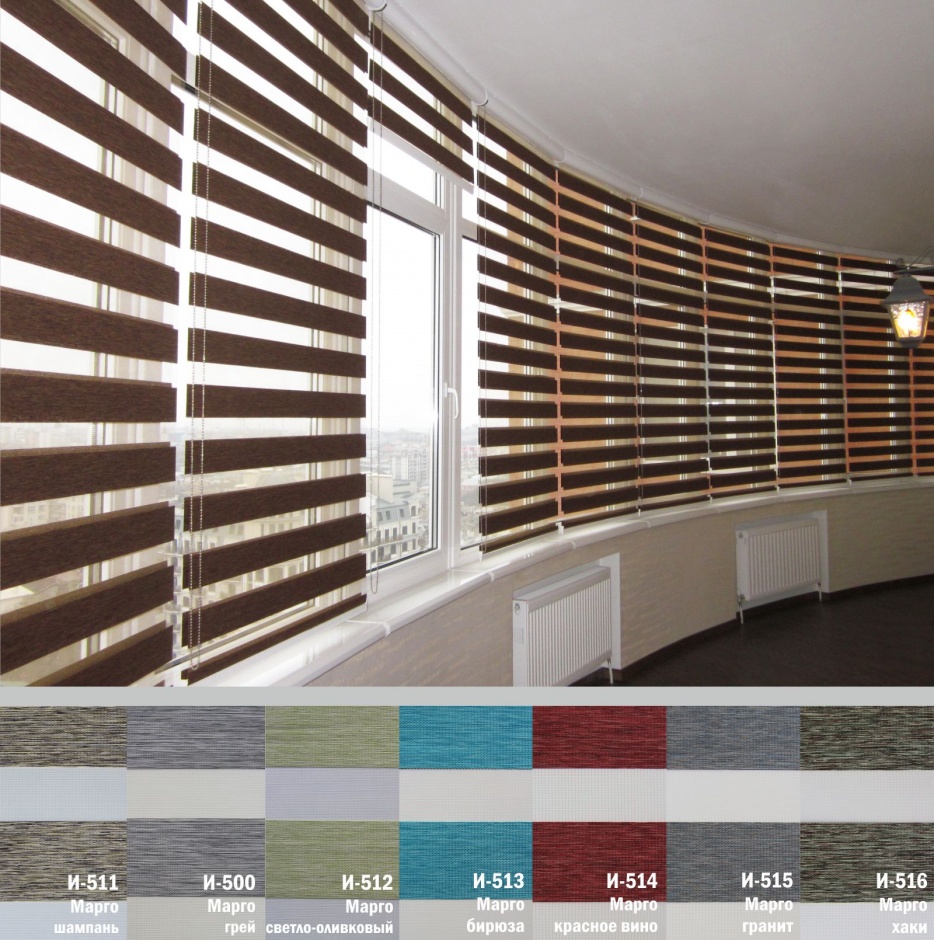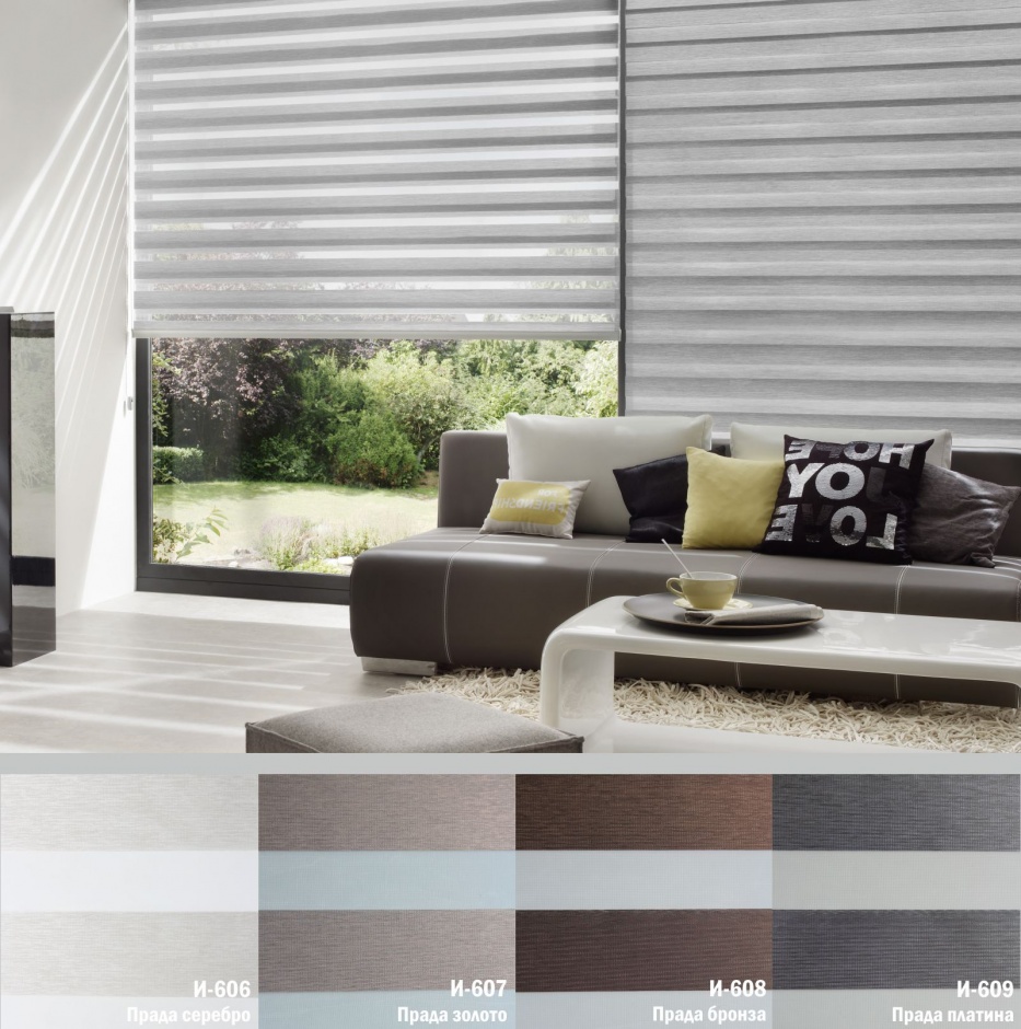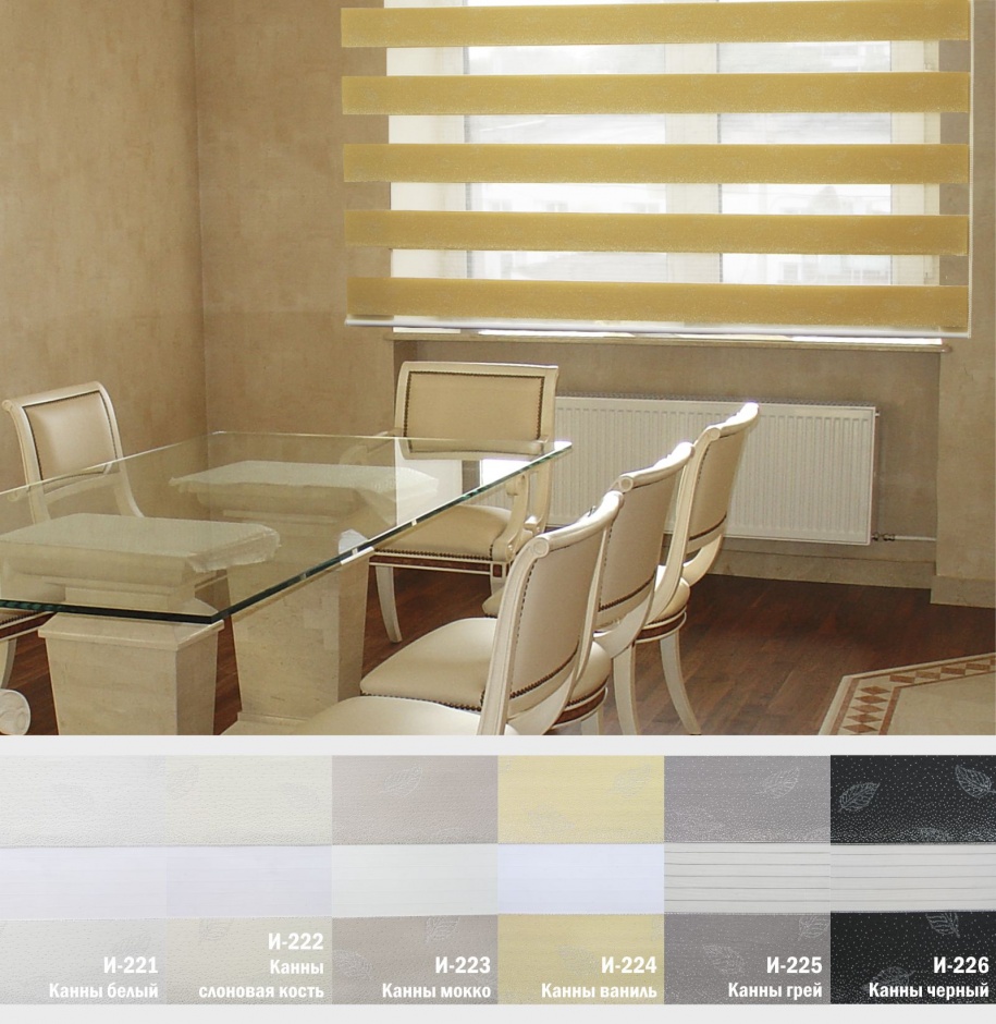 Подвійне полотно складається з горизонтальних смуг, що чергуються. Темні смуги виготовляються із щільних непрозорих матеріалів різних кольорів, а світлі – із легкої сітчастої тканини. Зміна режиму освітлення відбувається за рахунок усунення цих смуг. Штори працюють у трьох режимах: