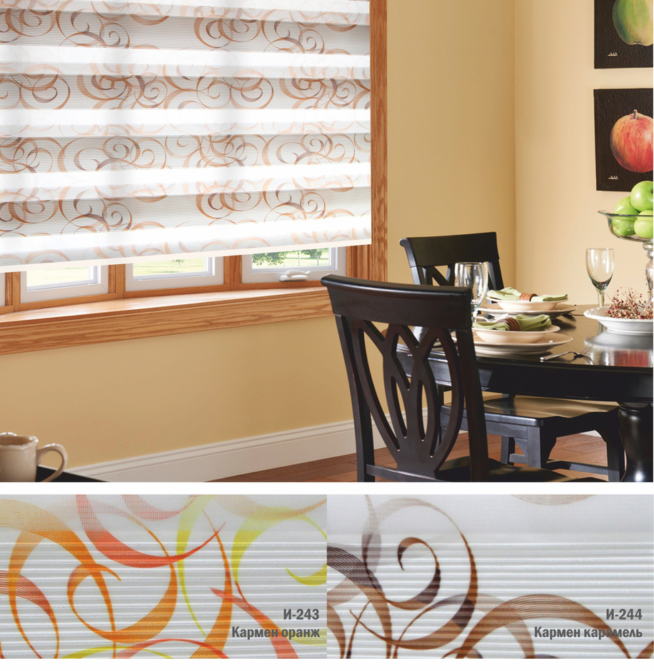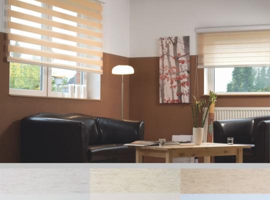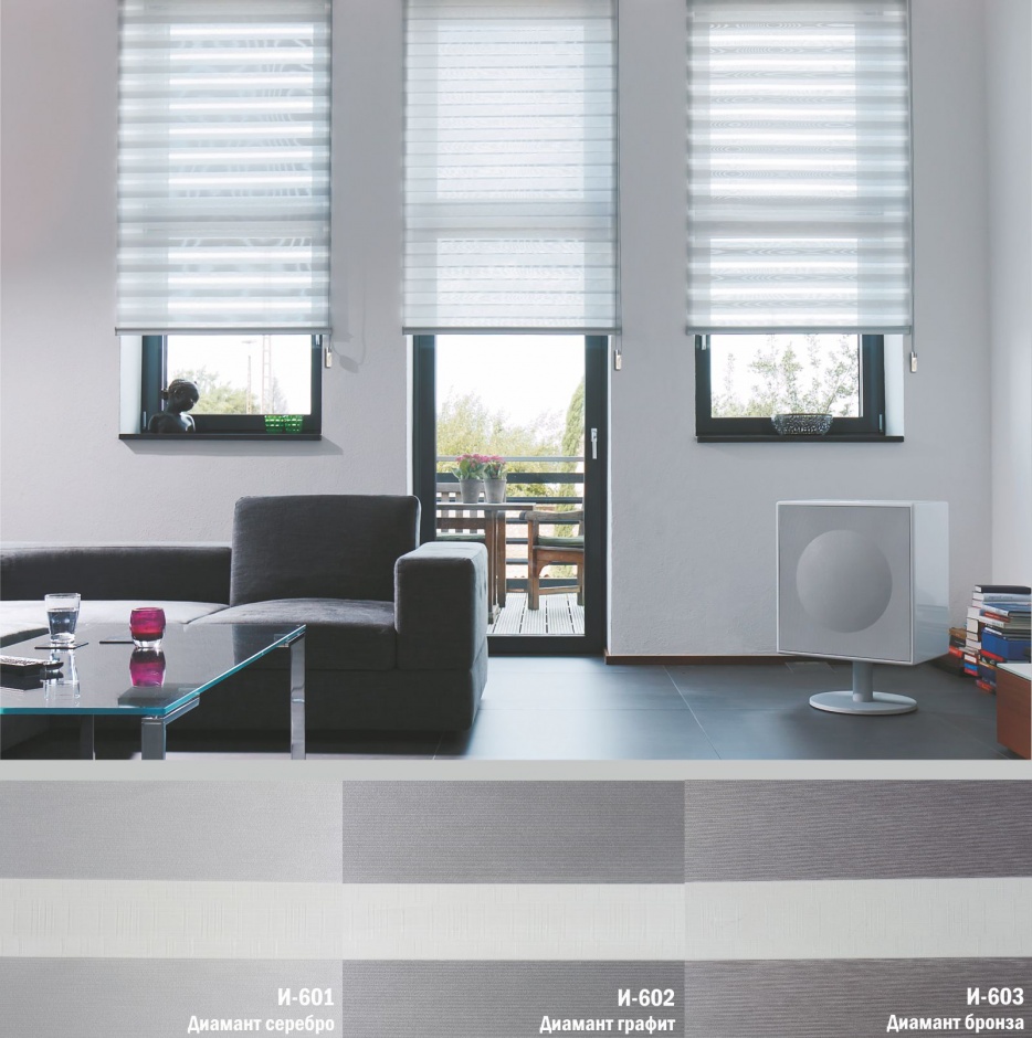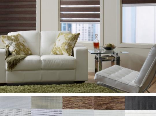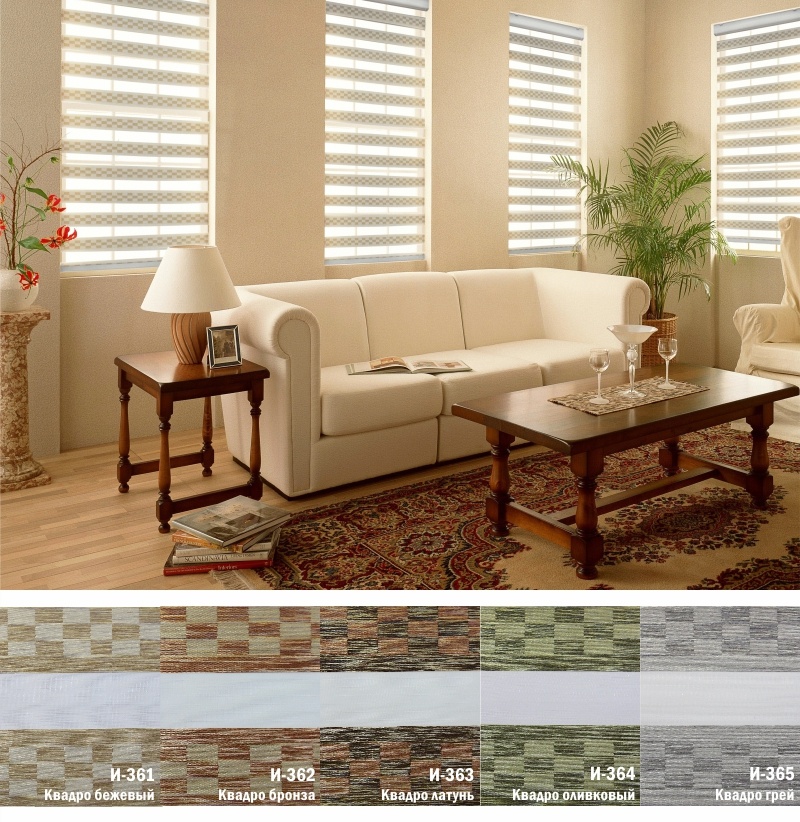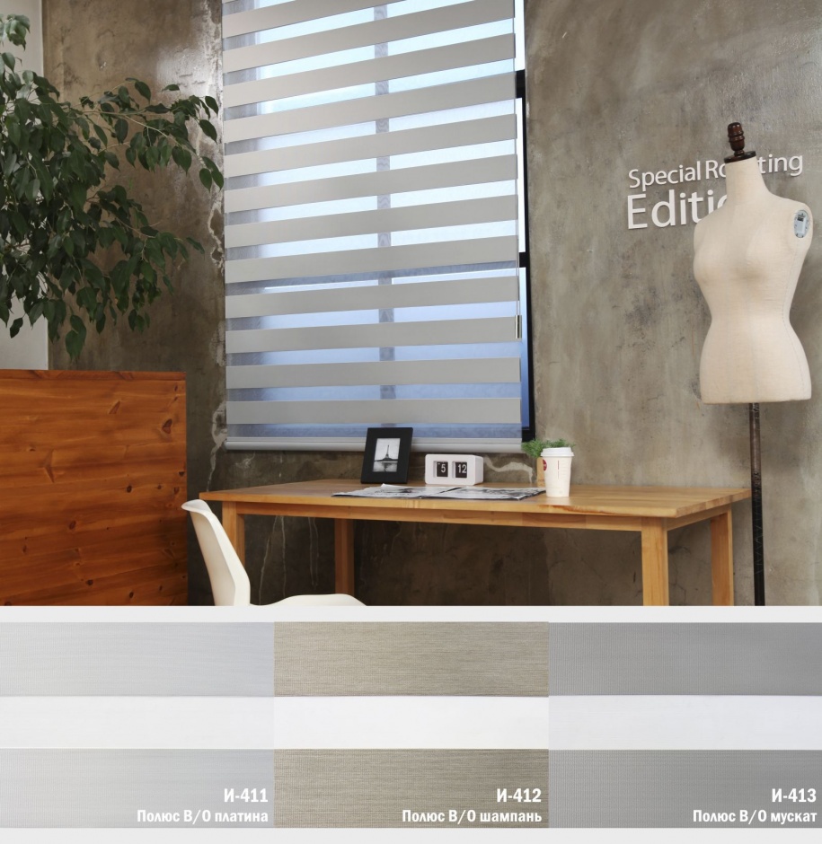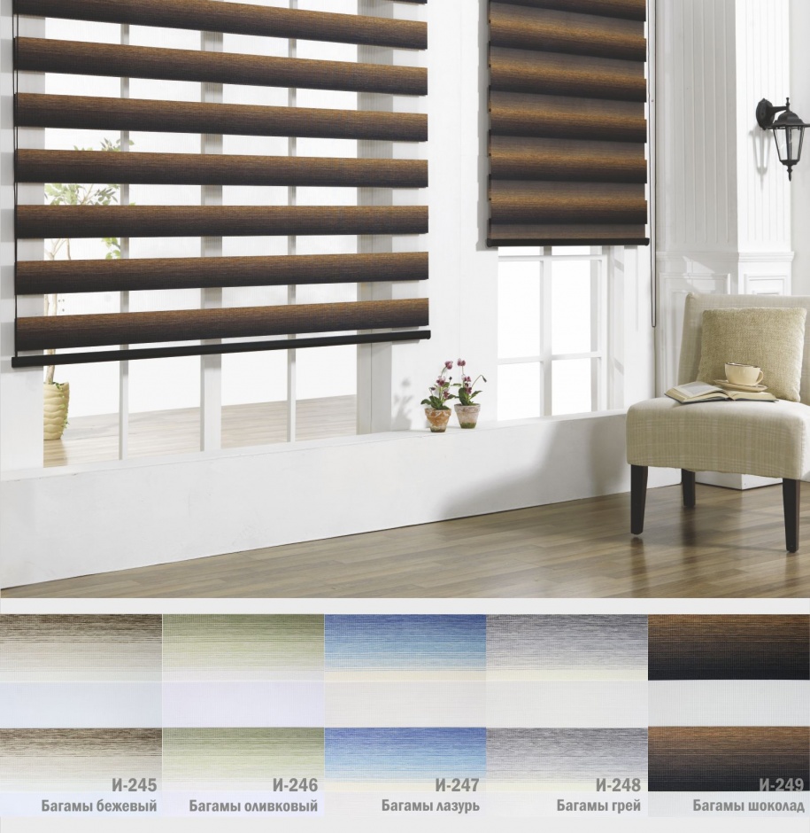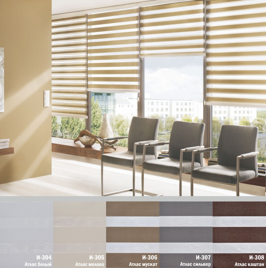Подвійне полотно складається з горизонтальних смуг, що чергуються. Темні смуги виготовляються із щільних непрозорих матеріалів різних кольорів, а світлі – із легкої сітчастої тканини. Зміна режиму освітлення відбувається за рахунок усунення цих смуг. Штори працюють у трьох режимах: