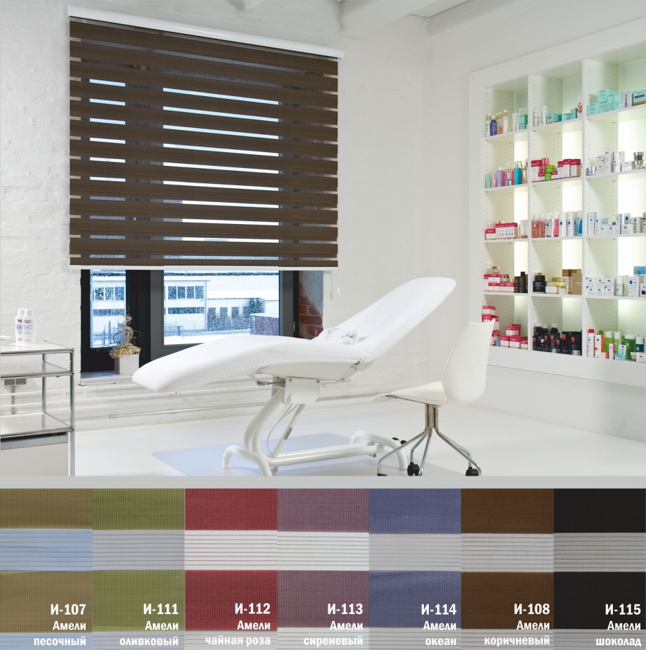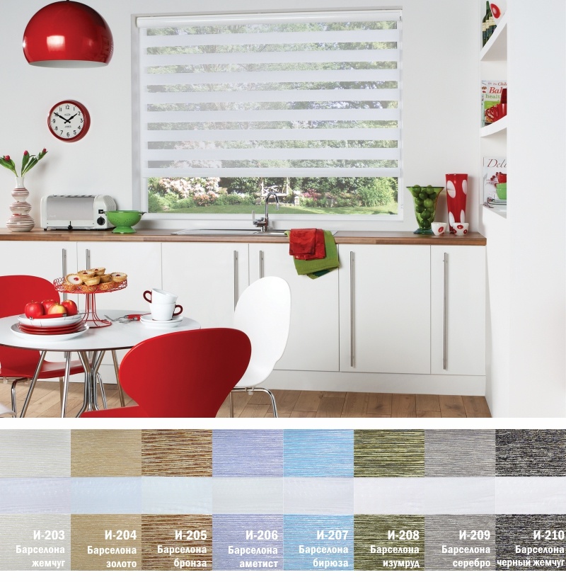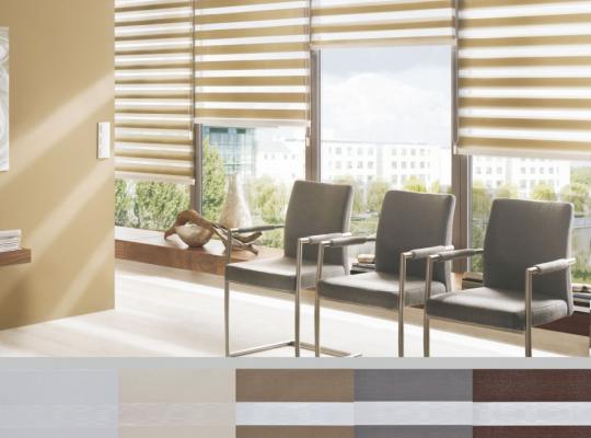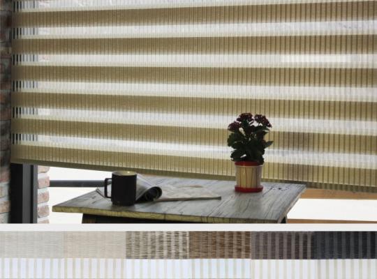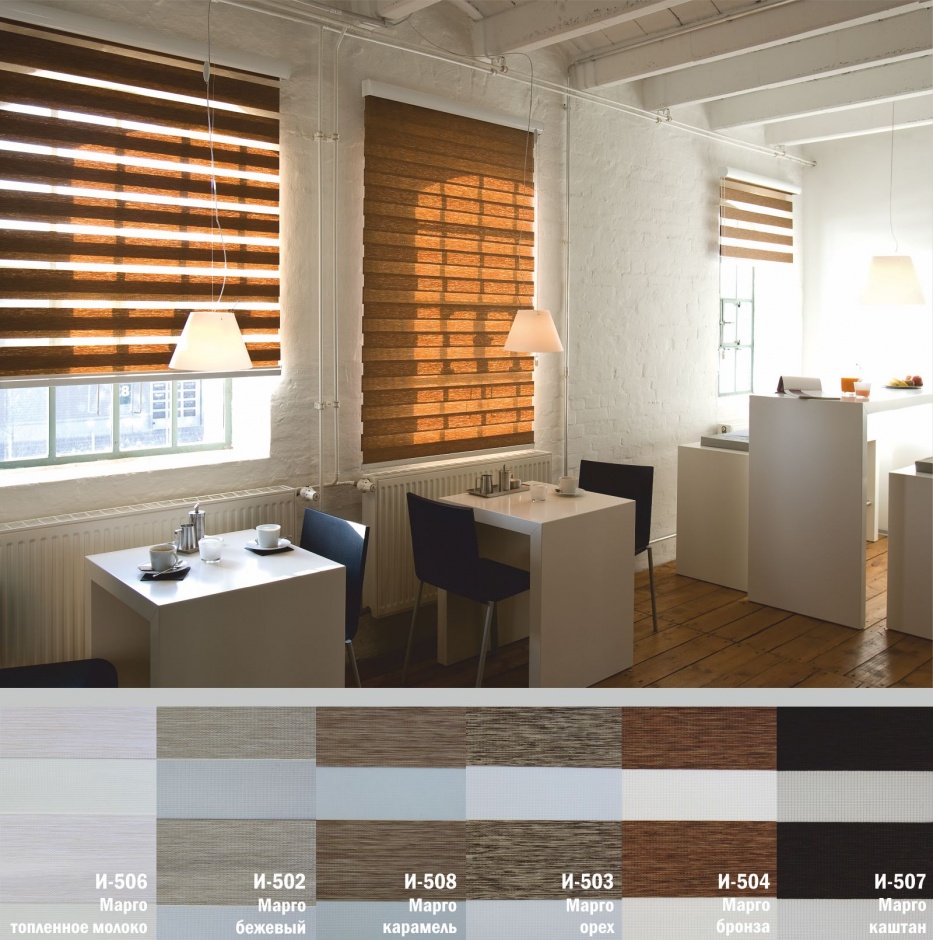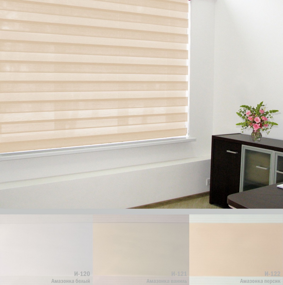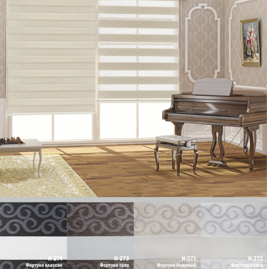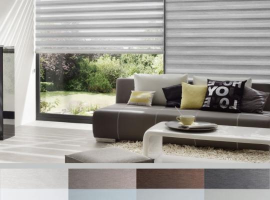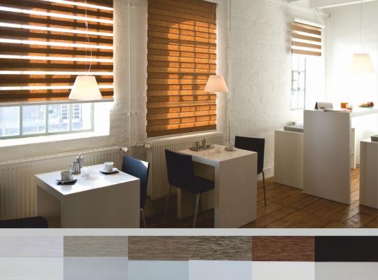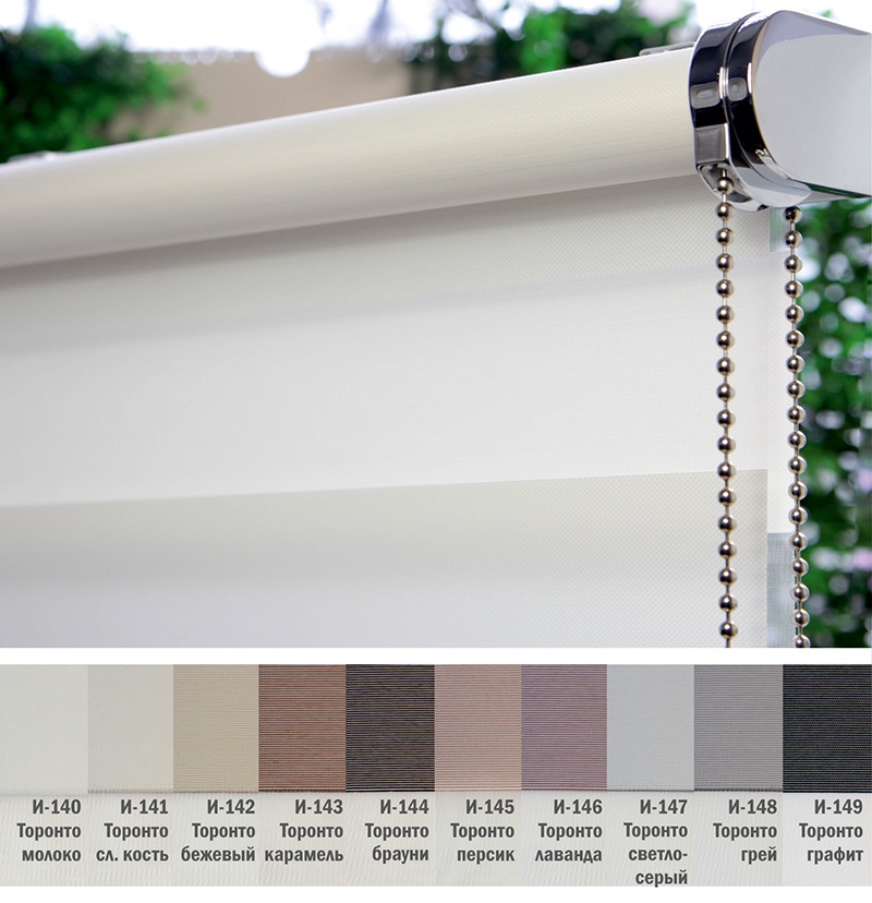 Подвійне полотно складається з горизонтальних смуг, що чергуються. Темні смуги виготовляються із щільних непрозорих матеріалів різних кольорів, а світлі – із легкої сітчастої тканини. Зміна режиму освітлення відбувається за рахунок усунення цих смуг. Штори працюють у трьох режимах: