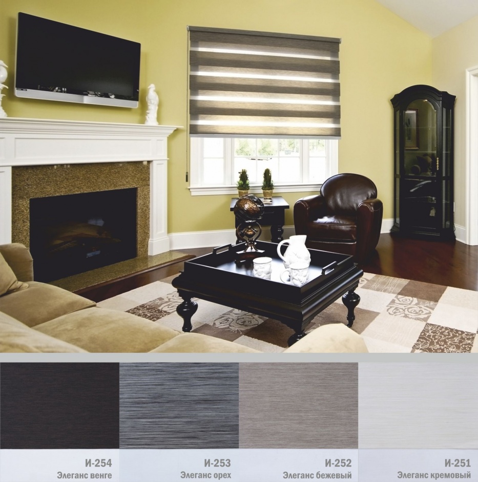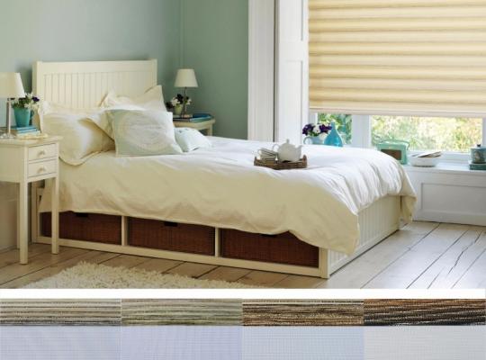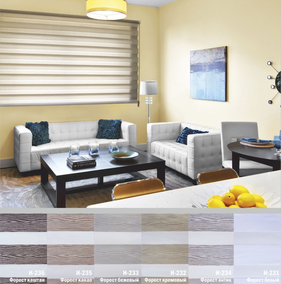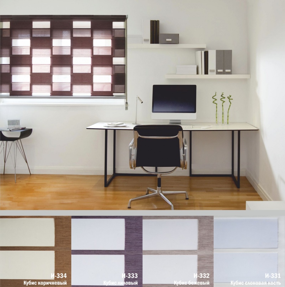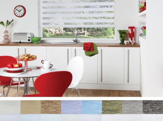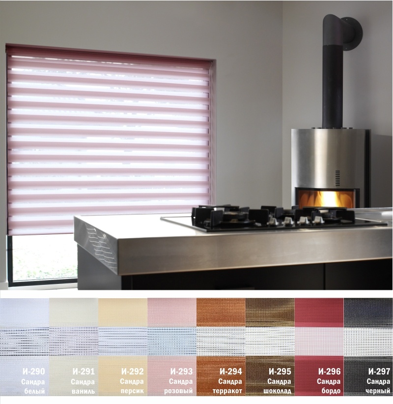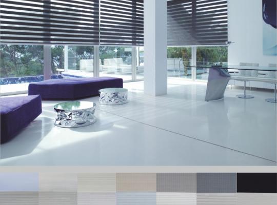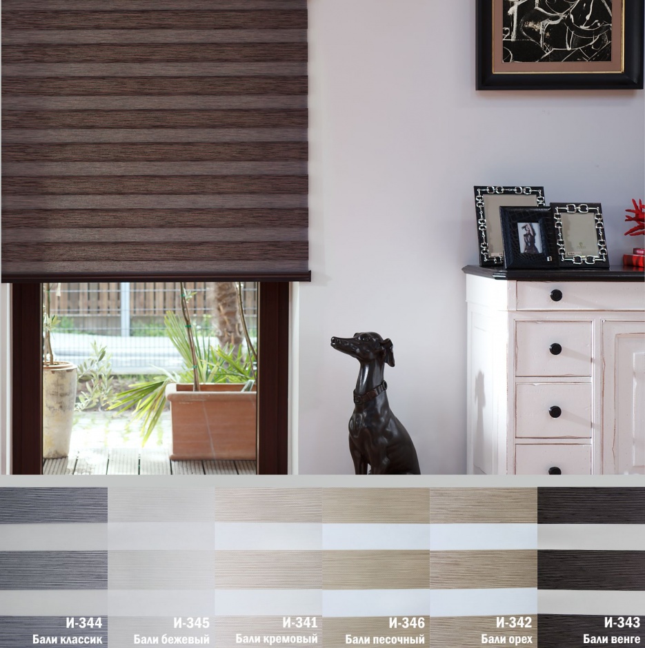 Подвійне полотно складається з горизонтальних смуг, що чергуються. Темні смуги виготовляються із щільних непрозорих матеріалів різних кольорів, а світлі – із легкої сітчастої тканини. Зміна режиму освітлення відбувається за рахунок усунення цих смуг. Штори працюють у трьох режимах: